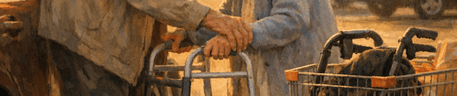 There she was, walking beside him as he rolled the shopping cart. His walker was inside the cart. He parked the cart at the trunk, then escorted her to the passenger side, again using the car for balance. He opened her door, waited until she was safely seated, then used her walker to get back to the trunk. He loaded both walkers and the groceries into the car, secured the cart between our vehicles, and slowly made his way back to the driver’s side.